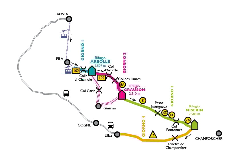 Dal Rifugio Arbolle proseguire sul sentiero 102 in direzione del Col d'Arbolle in un ambiente alpino solitario e selvaggio (la discesa dal Col d'Arbolle verso il Col Laures può risultare ripida e scivolosa in alcuni periodi della stagione, consultare i gestori per conoscere le condizioni attuali del sentiero)*, risalire verso il Col de Laures (Sentiero 4) e ridiscendere verso i suggestivi Laghi di Lussert (Sentiero 8A) per arrivare, attraverso ampi e verdi prati, sino al Rifugio Grauson.