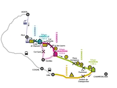 Tempo: 4h20 - Distanza: 14,5 km - Quota partenza: 2.588 m - Quota arrivo: 1.613 m - Punto più alto: 2.819 m (Fenêtre de Champorcher) Dislivello positivo: 401 m - Difficoltà: E - Sentieri: AV2